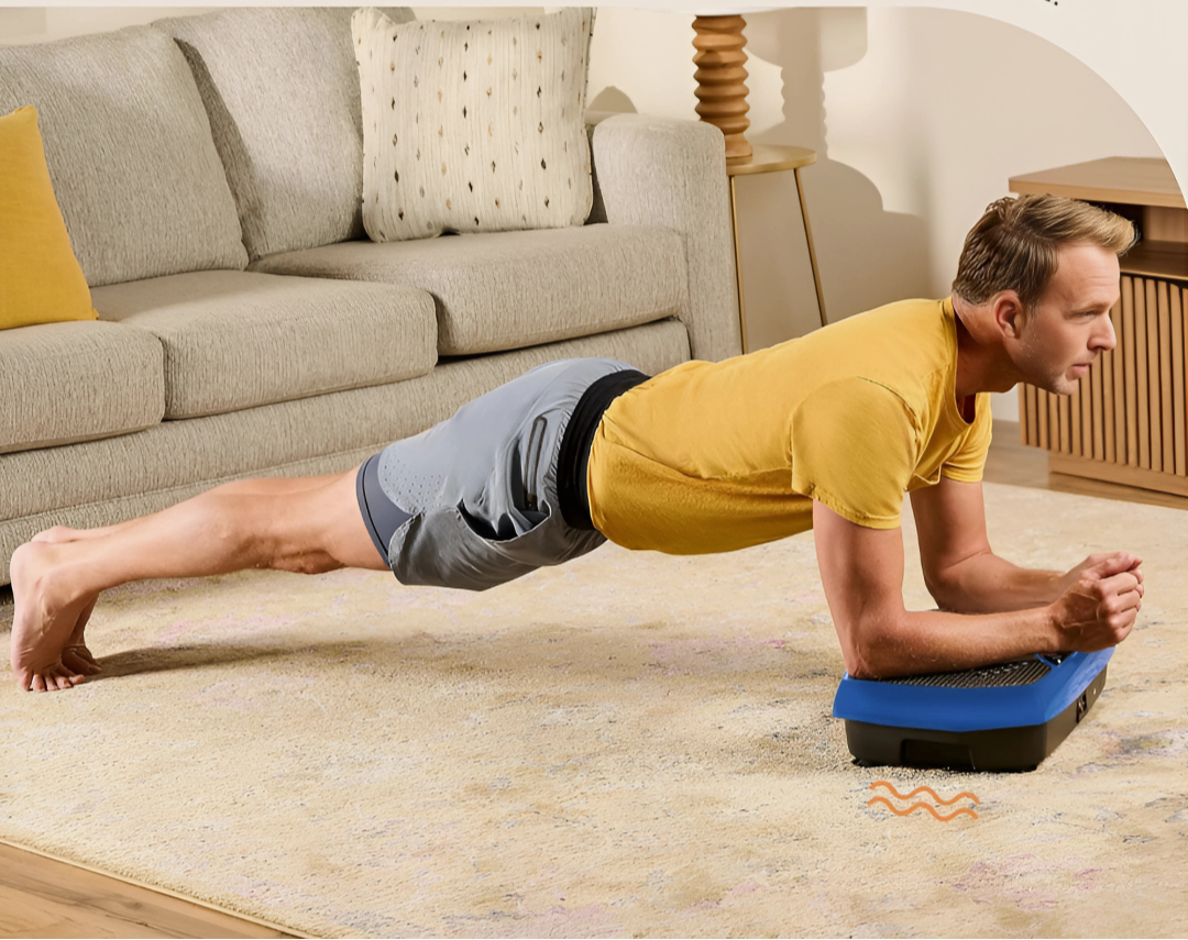 Engages in a forearm plank on a blue oscillating vibration platform, promoting muscle engagement and stability. This exercise improves overall balance and coordination, perfect for anyone seeking an effective workout routine.